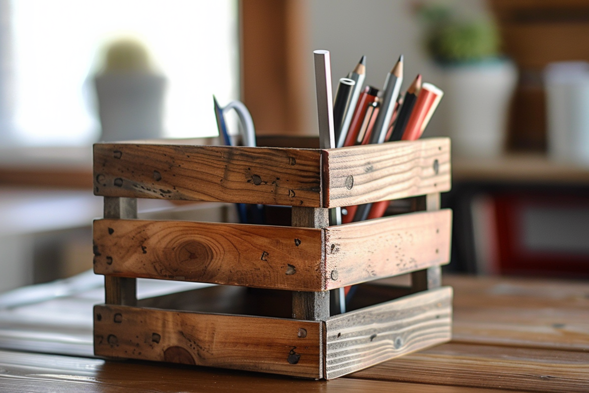 This compact desk piece brings rural character into everyday spaces. Built with slatted detail and sturdy corner posts, it reflects practical function, careful craftsmanship, and a subtle nod to agricultural heritage — reimagined for the modern bench or office desk.